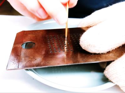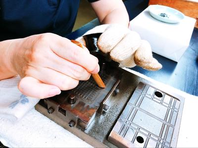 Rubbing hot damper rubbers in the mold with the wooden spatula.