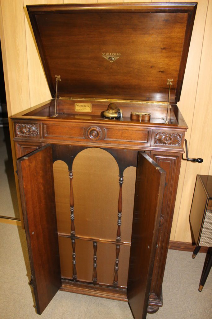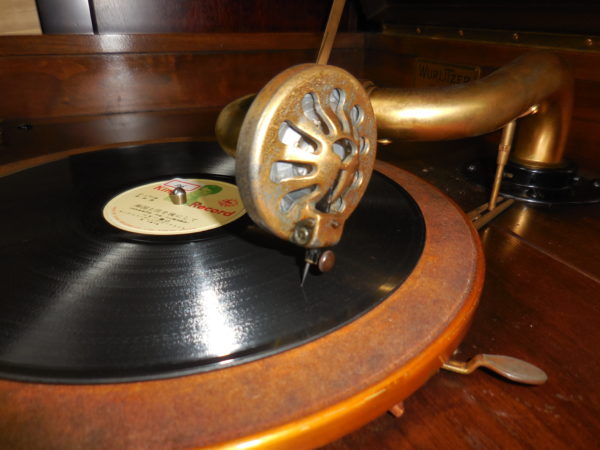 The early types of phonograph have the horn outside the case, but horn was put inside the box with the passage of time. The materials of horn are wood, metal, paper, and ceramic. It is clockwork without electricity, so unable to adjust the volume, but afterwards electric phonograph appeared.