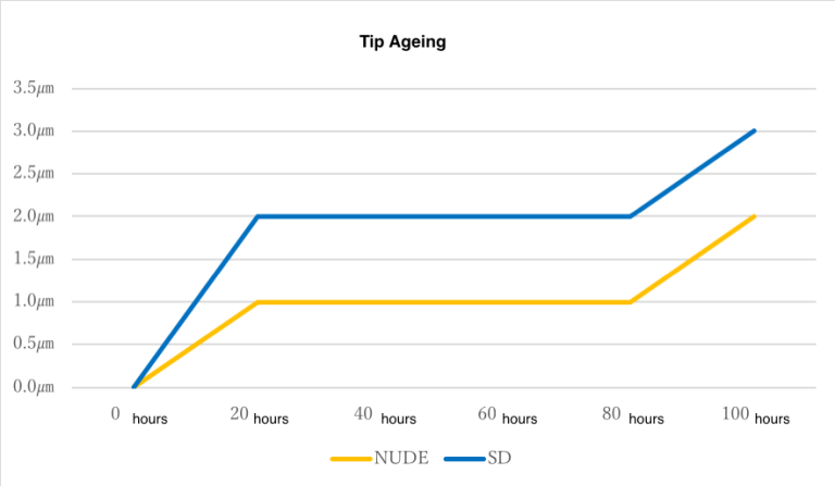 Additionally, we perform several other tests to evaluate the success or failure of the new stylus tips. The data presented below is based on an individual examination of every single stylus in our company, and we have also compared the results with NUDE, SAS, and other stylus tips.