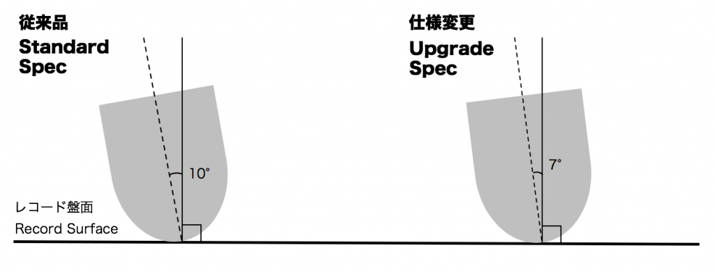 The angle at which the stylus tip contacts the record groove is decreased from the standard 10° tilt to 7°, same as the SHURE design.